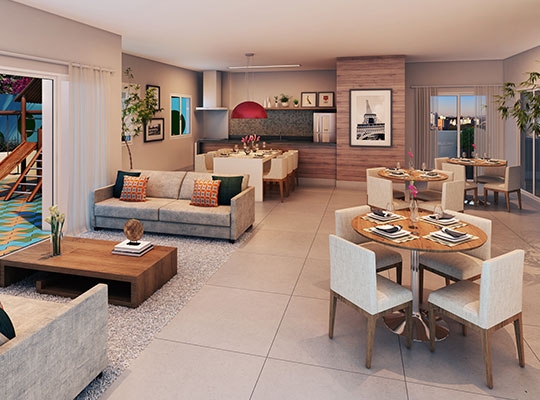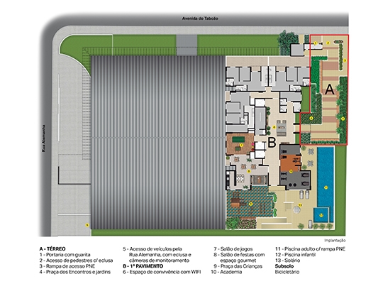 Área de lazer: Salão de festas com espaço gourmet – Jardins -Praça dos Encontros – Bicicletário – Praça das Crianças – Academia – Salão de jogos – Piscinas adulto com rampa PNE e infantil – Solário e Espaço de convivência com WIFI