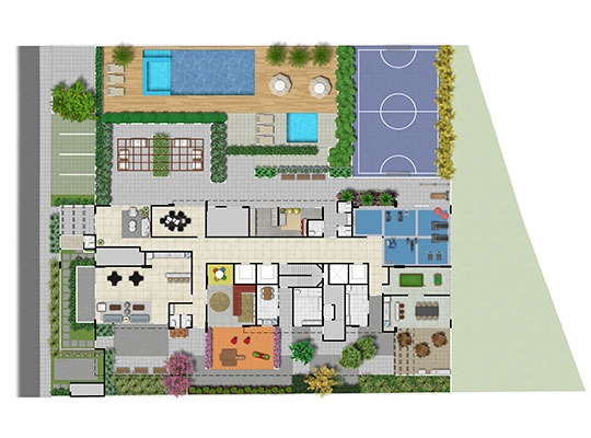 Área de lazer: Piscina Adulto e Infantil – Academia – Lavanderia Coletiva – Salão Gourmet – Salão de Festas – Sala de reunião – Churrasqueira – Playground – Brinquedoteca – Quadra