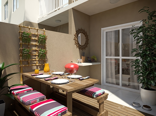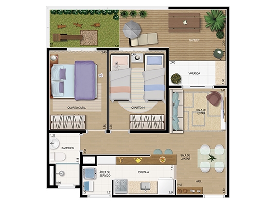60,16 m² privativos 2 dorms. – sendo 46,79m² + 13,37 m² de jardim privativo – 1 vaga descoberta