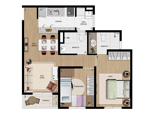 50,58 m² privativos 2 dorms. – com suíte – 1 vaga – 68 unidades
