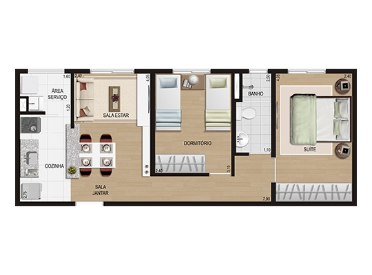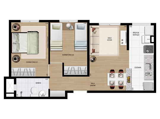 44,58 m² privativos 2 dorms. – sem suíte – 1 vaga – 64 unidades